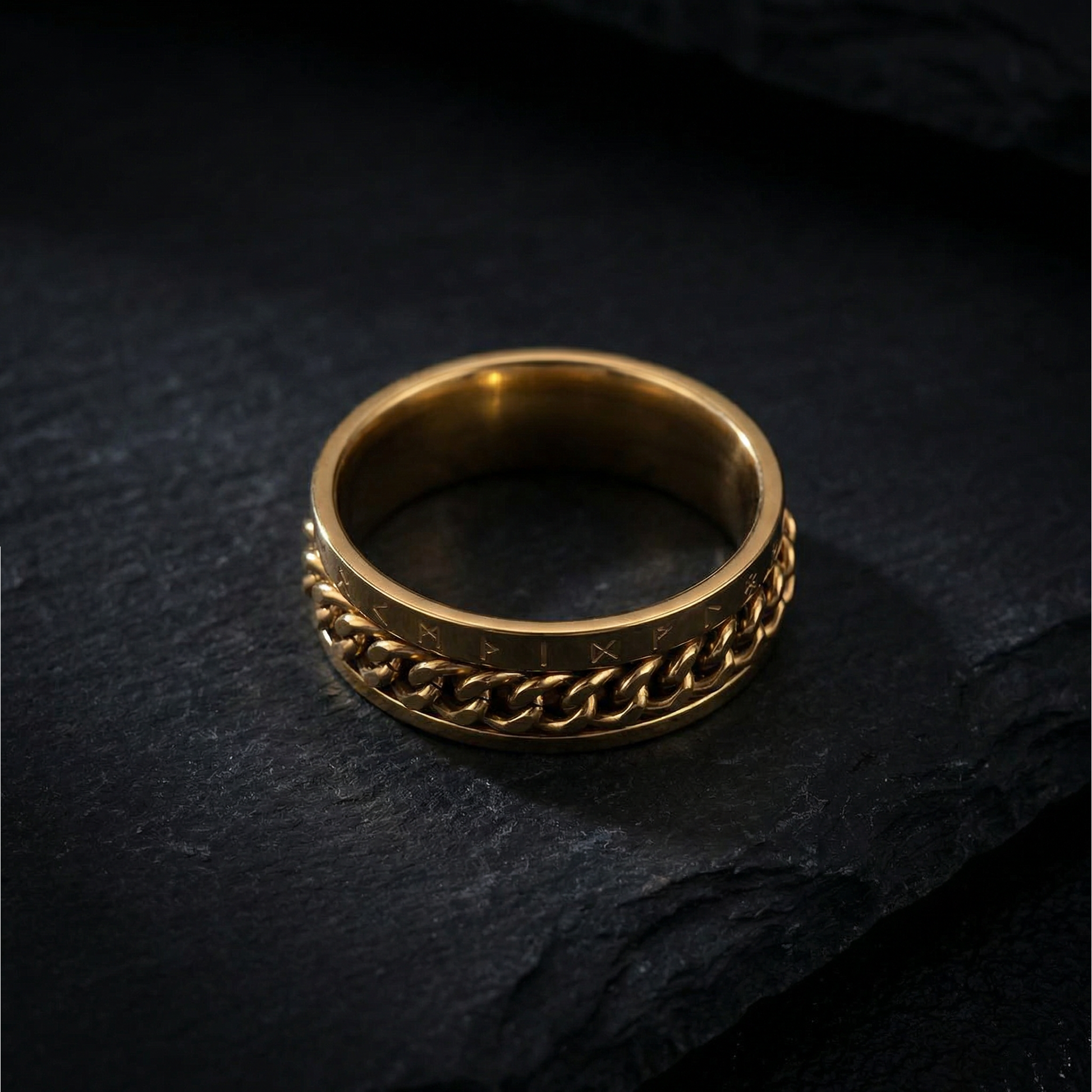 The Runic Chainbound Ring, Gold unites ancient runes with a distinctive chain forged directly into the band. The runes stand for guidance, protection, and timeless wisdom, while the chain represents connection, strength, and continuity. Every link reflects the path you walk and the choices that bind your journey together. This ring is made for those who value meaning over ornament and carry their symbols with quiet confidence. A bold yet balanced statement of identity and inner resolve.