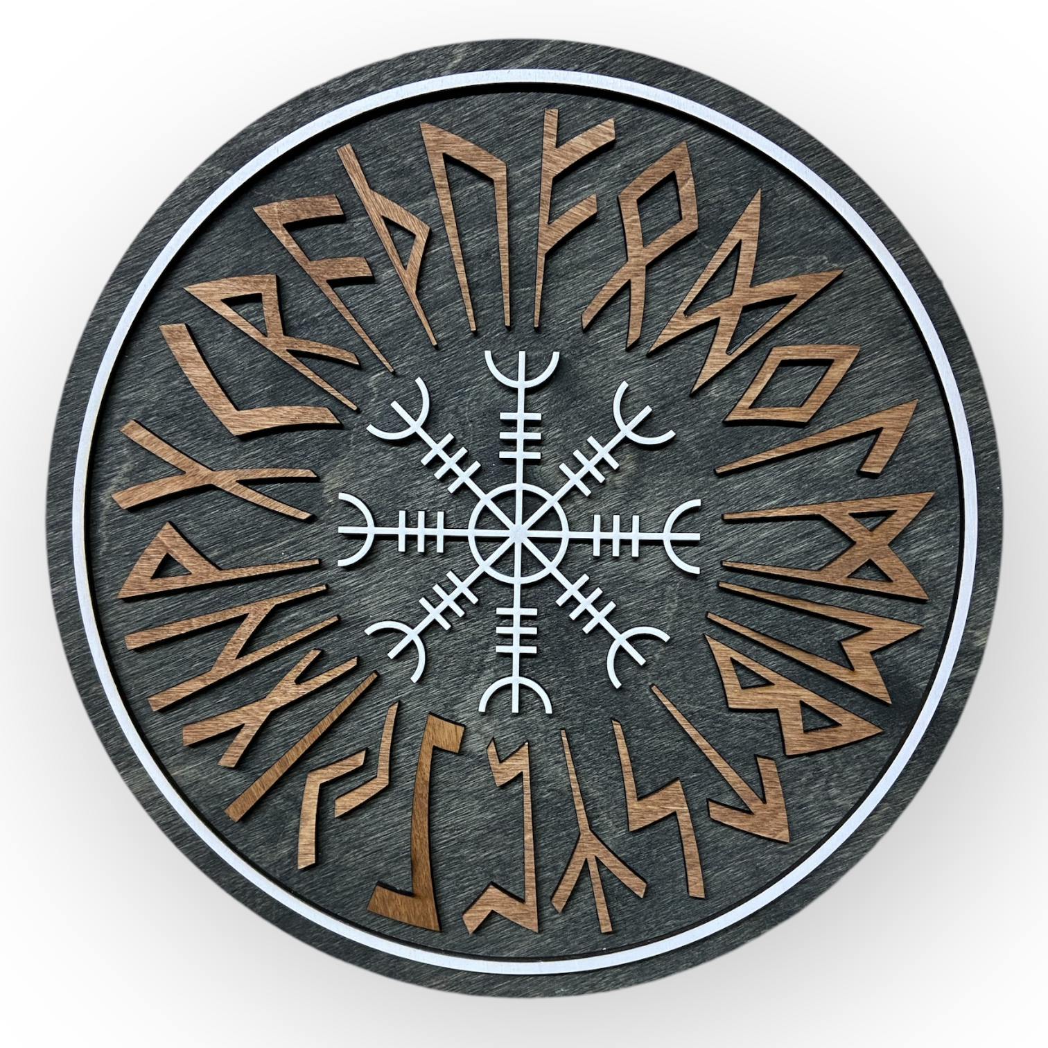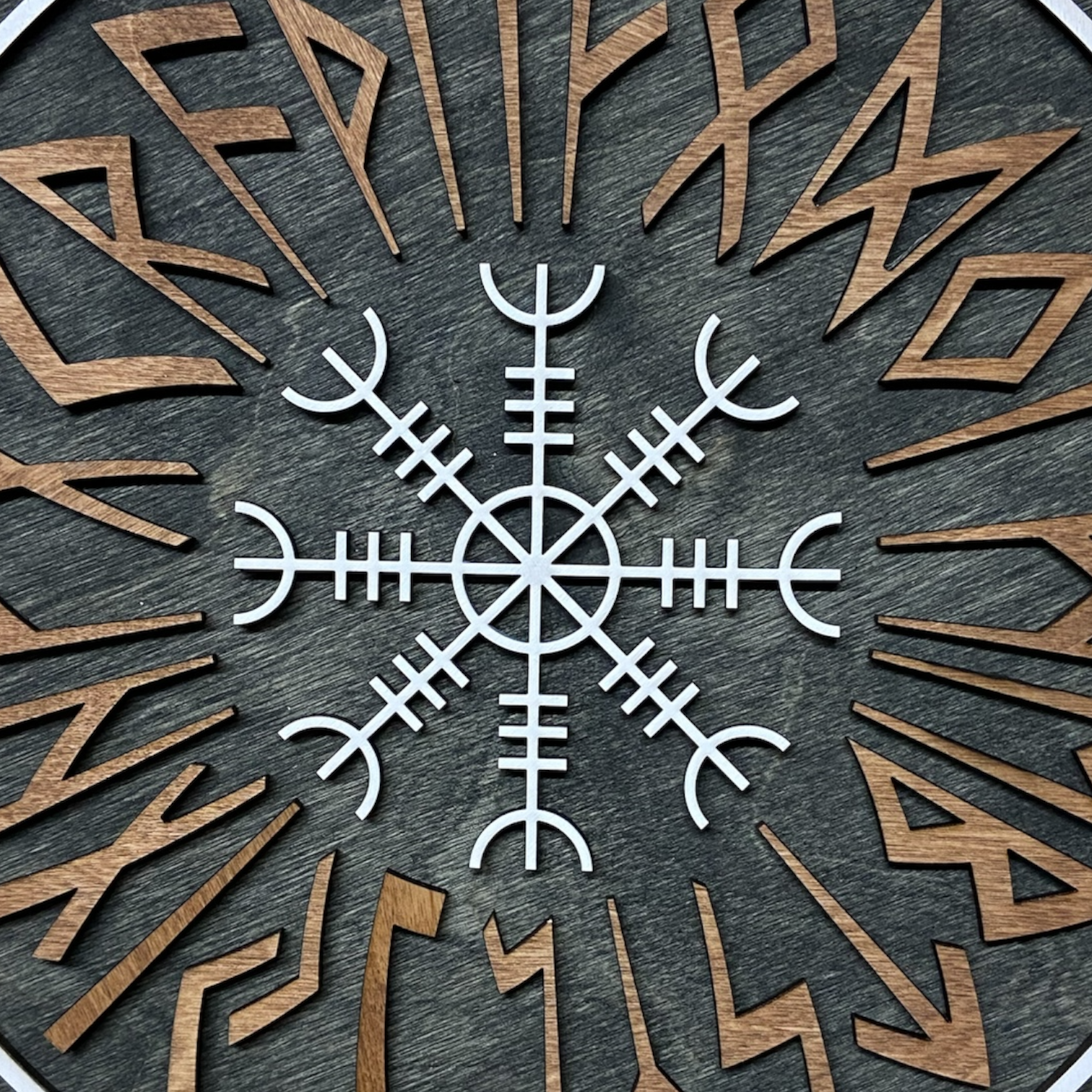En central Vegvísir inramas av en djärv runcirkel, vilket bildar en tydlig och balanserad komposition.