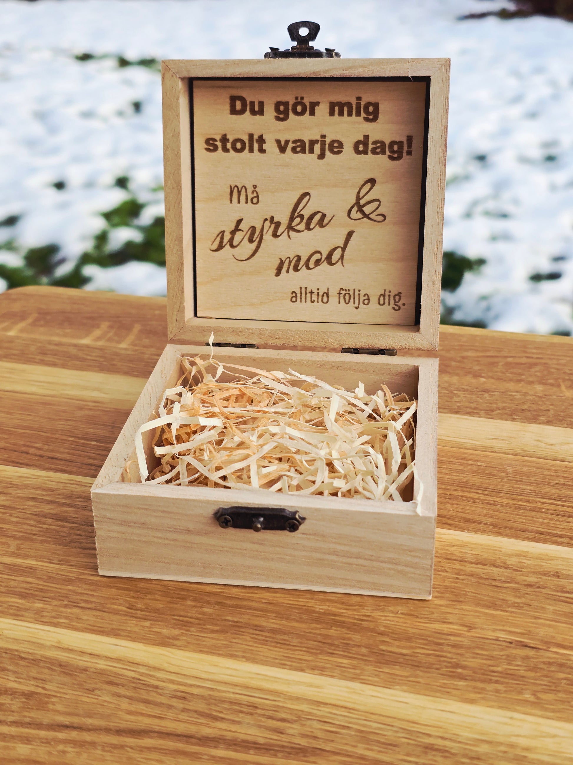Ett permanent graverat träinlägg inuti locket möjliggör personliga namn, datum eller meddelanden.