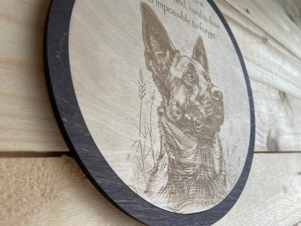 - Material: Tillverkad av hållbar plywood som ger en tydlig och exakt avbildning av ditt valda hundmotiv. Grundplattan består av MDF, där en bildhängare är infälld för att tavlan ska kunna monteras platt mot väggen.