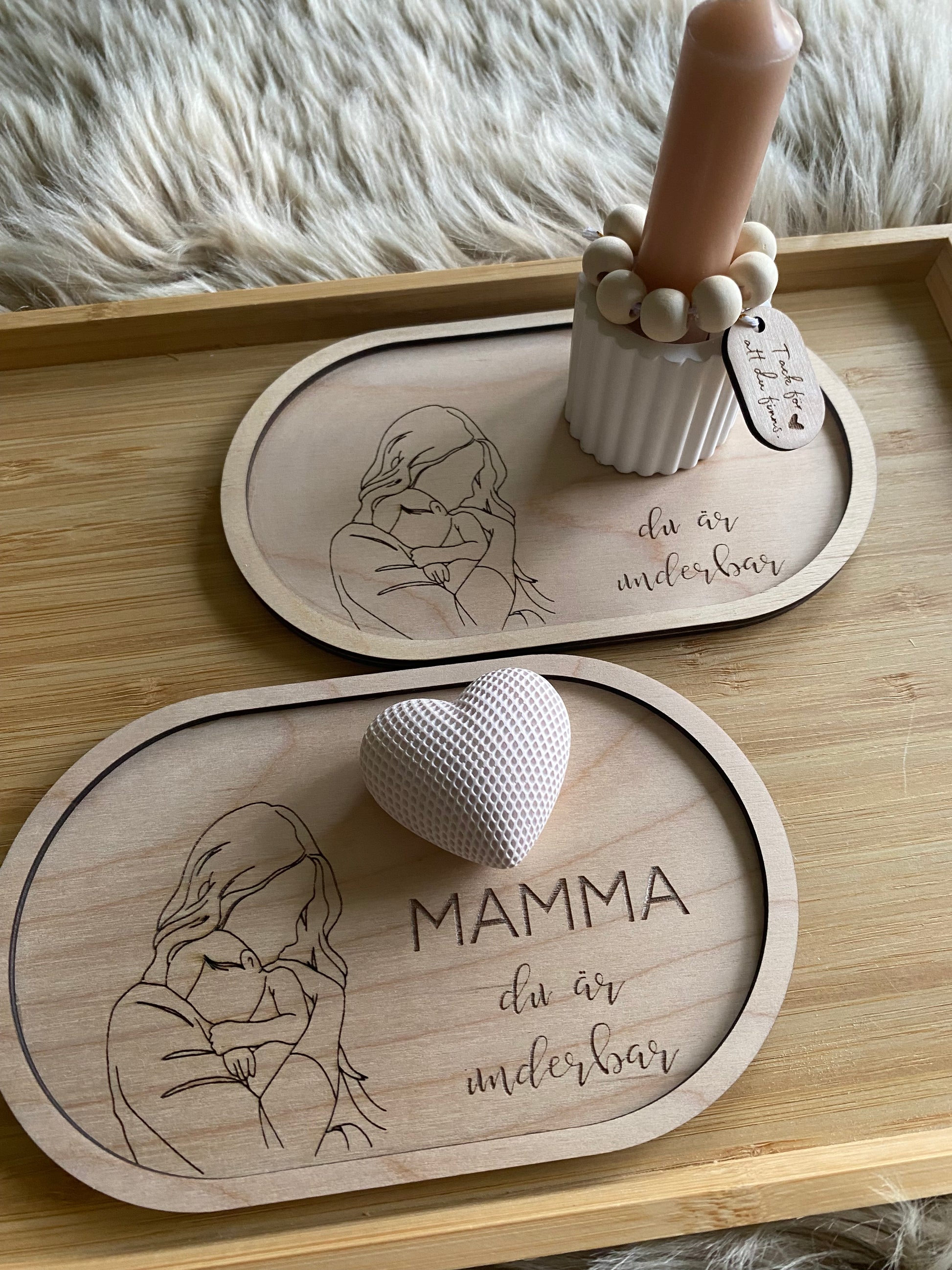 En kärleksfull gåva till någon som alltid finns där. Denna vackert graverade bricka i trä föreställer en mamma som håller sitt barn – en symbol för närhet, trygghet och ovillkorlig kärlek.