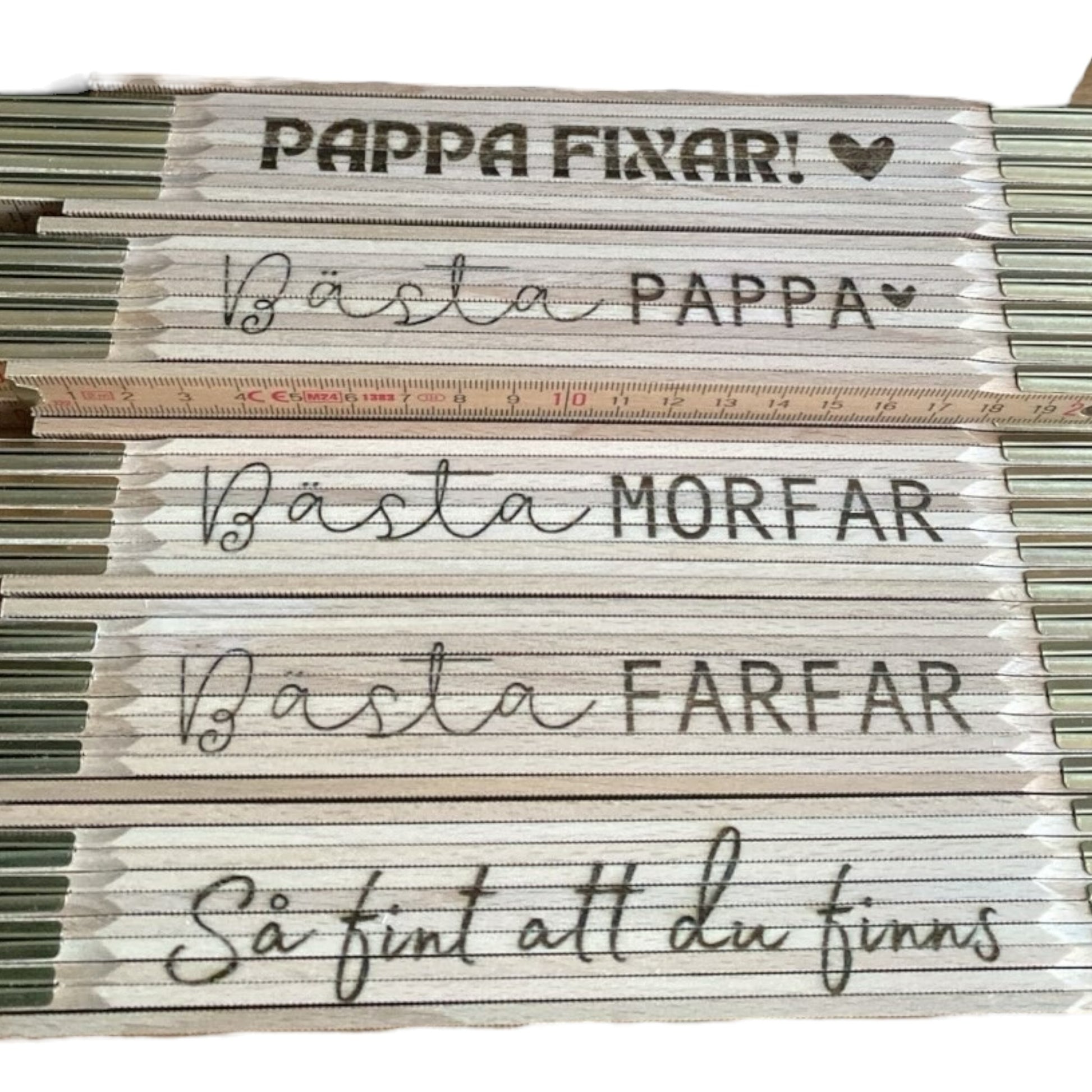 Vår personligt graverade tumstock är den perfekta presenten för hantverkare, hemmafixare och alla som gillar att arbeta noggrant. Tumstocken kan beställas både med personlig gravyr och utan gravyr. Välj ditt alternativ och skriv in din personliga text direkt i det angivna fältet. Oavsett om det är ett namn, datum, rolig text eller företagslogotyp – designa tumstocken precis som du vill.