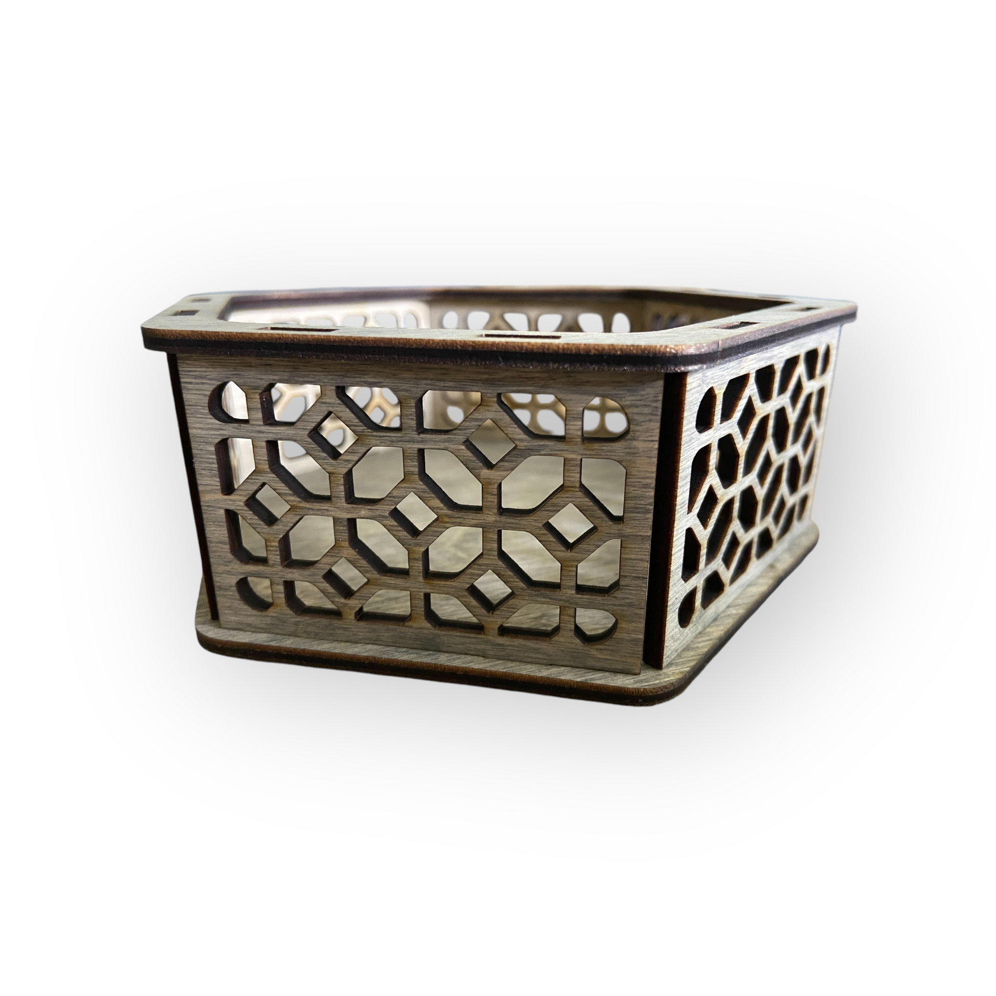 Denna eleganta förvaringsskål i hexagonal form (126 x 143 x 50 mm) är en riktig blickfångare. Med sitt vackra, utskurna mönster runtom är den perfekt för att förvara småsaker, som en elegant ljushållare eller som en unik gåva. Tillverkad av högkvalitativt material och inoljad i önskad färgton, ger skålen en varm och dekorativ touch till varje rum. Ett mångsidigt tillbehör som harmoniskt förenar funktion och design!