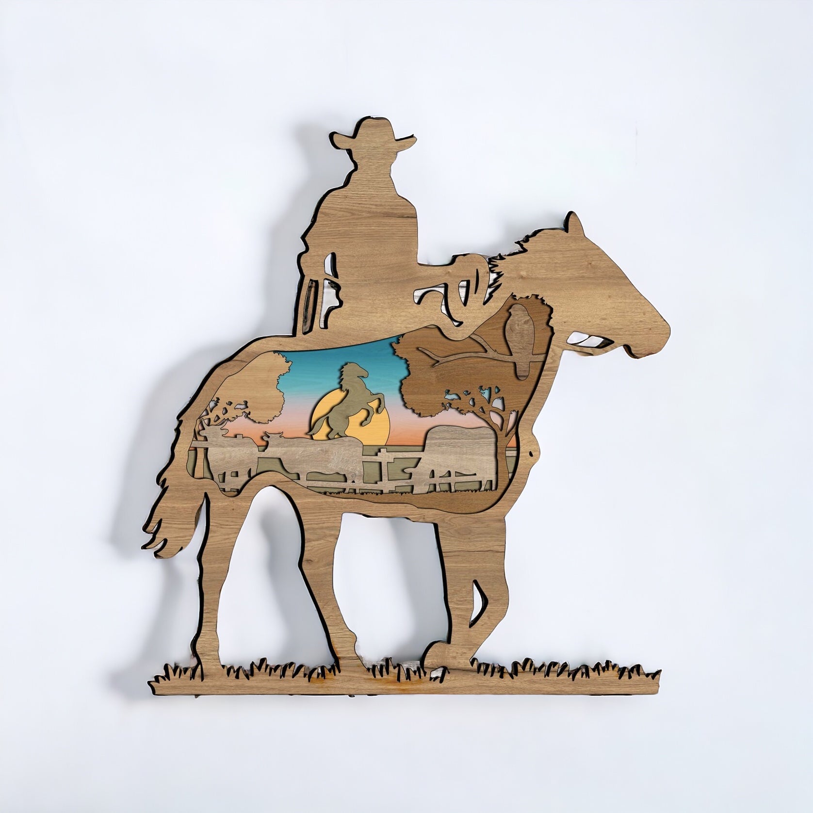 Detta konstverk är mer än bara en bild – det är en 3D-upplevelse! Bestående av 9 träskikt, är varje lager skickligt utformat för att skapa en imponerande djupkänsla som gör att bilden känns levande. I förgrunden ser vi en cowboyridande på sin häst, medan den fridfulla naturen breder ut sig i bakgrunden med lugna kor som betar.