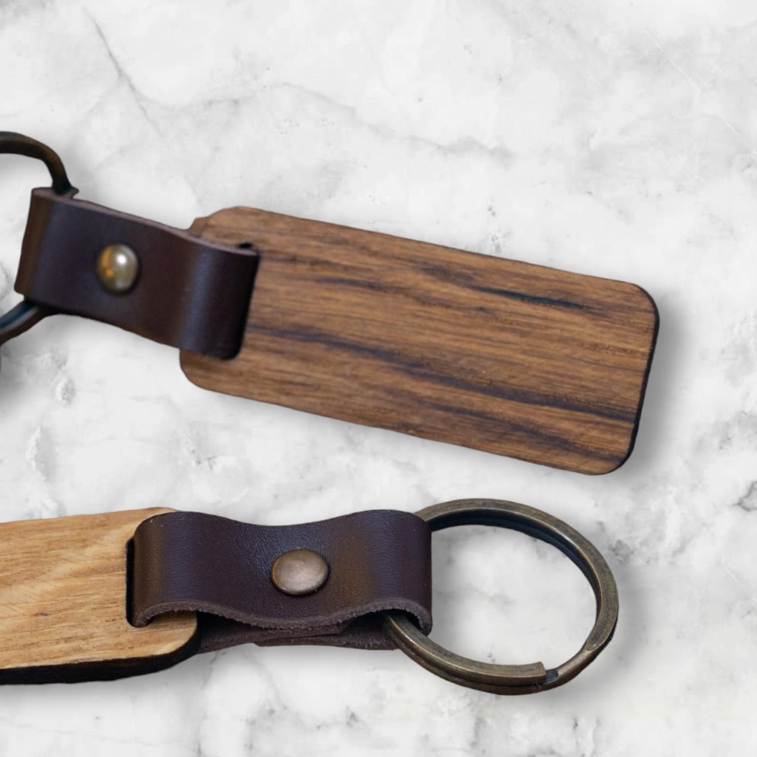 Nyckelring i trä av oljad ek med mörkbrun läderrem