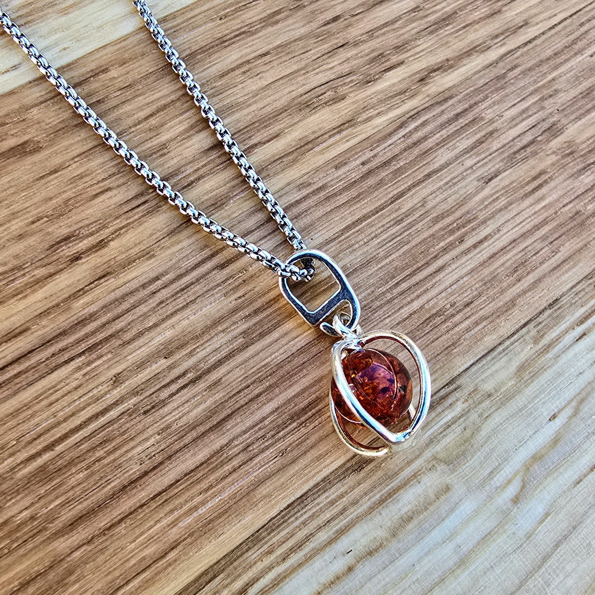 Detta eleganta hänge i 925 sterlingsilver pryds av en äkta bärnstenkula på ca 7 mm, skapad ur förstenad träharts som formats under miljoner år.