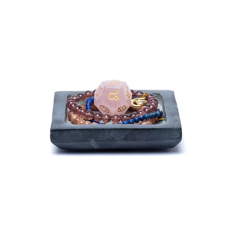 Denna mångsidiga och robusta kvadratiska specksten ger en stabil bas för ljus och skapar en naturlig, elegant atmosfär. Den dämpade färgen och den unika strukturen hos speckstenen gör underlägget även idealiskt som dekorativt fat eller smyckesbricka.