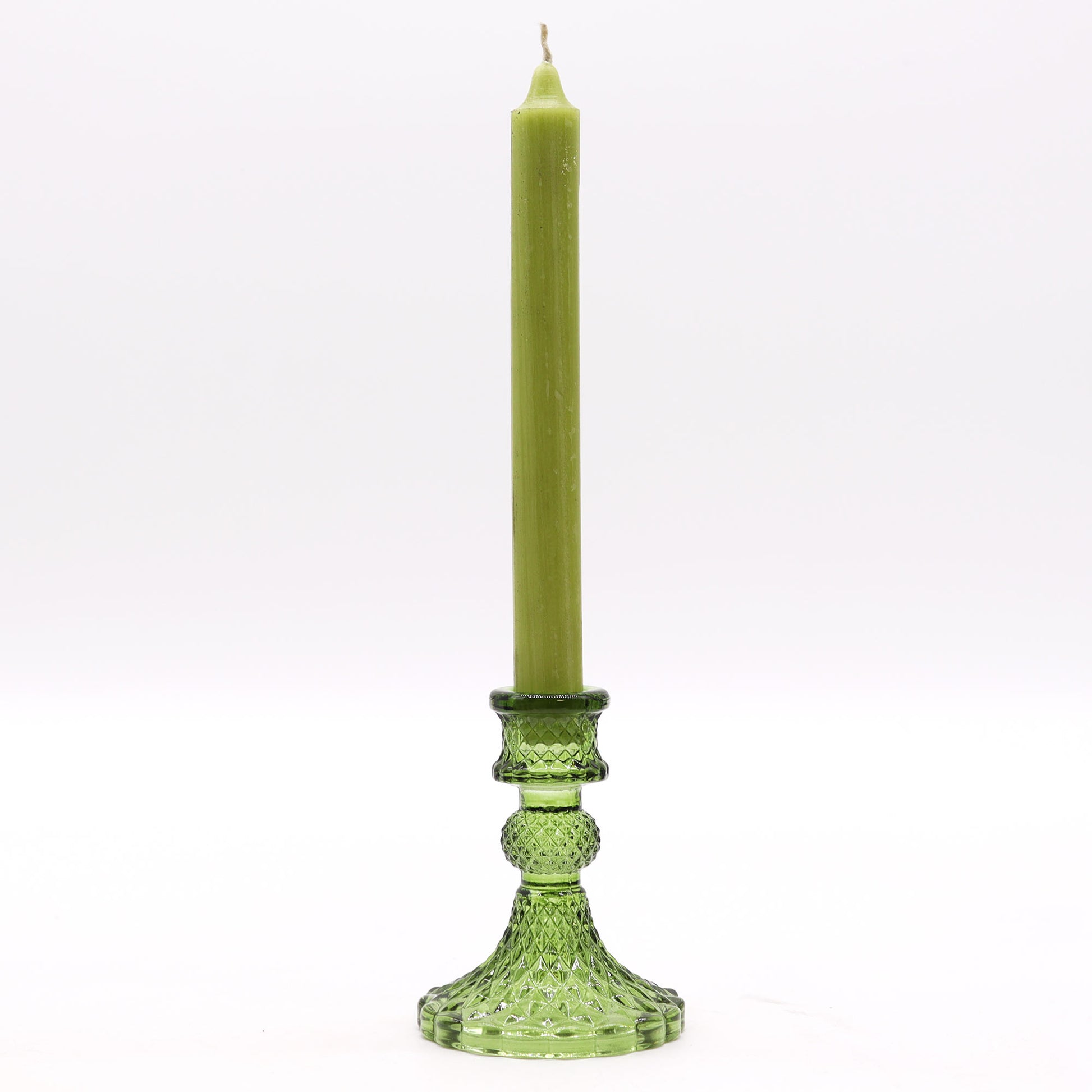Denna klassiska ljushållare i glas är designad i en tidlös vintage-stil med dekorativt, facetterat mönster som reflekterar ljuset på ett vackert sätt. Med sin kompakta form är den ett elegant inslag både till vardag och fest – lika fin på middagsbordet som i fönstret eller på altaret.
