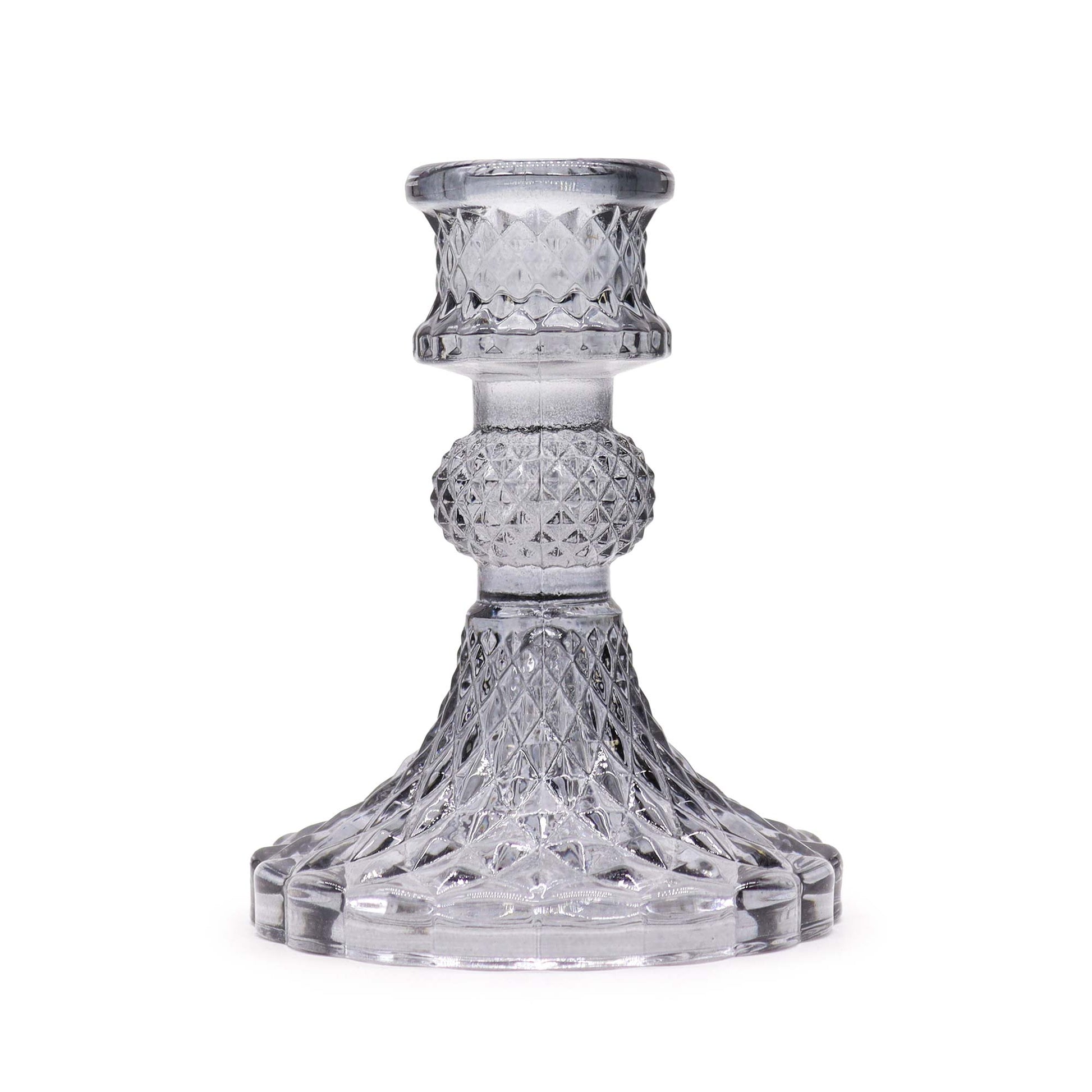 Denna klassiska ljushållare i glas är designad i en tidlös vintage-stil med dekorativt, facetterat mönster som reflekterar ljuset på ett vackert sätt. Med sin kompakta form är den ett elegant inslag både till vardag och fest – lika fin på middagsbordet som i fönstret eller på altaret.